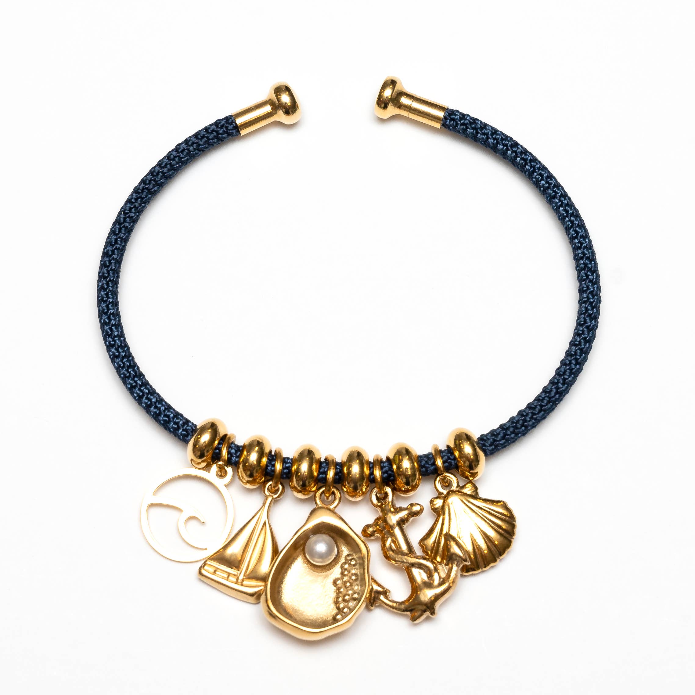 Navy blue cord cuff with gold plated charm detail, including a wave, sailboat, oyster shell, anchor, and clam shell One size fits most.