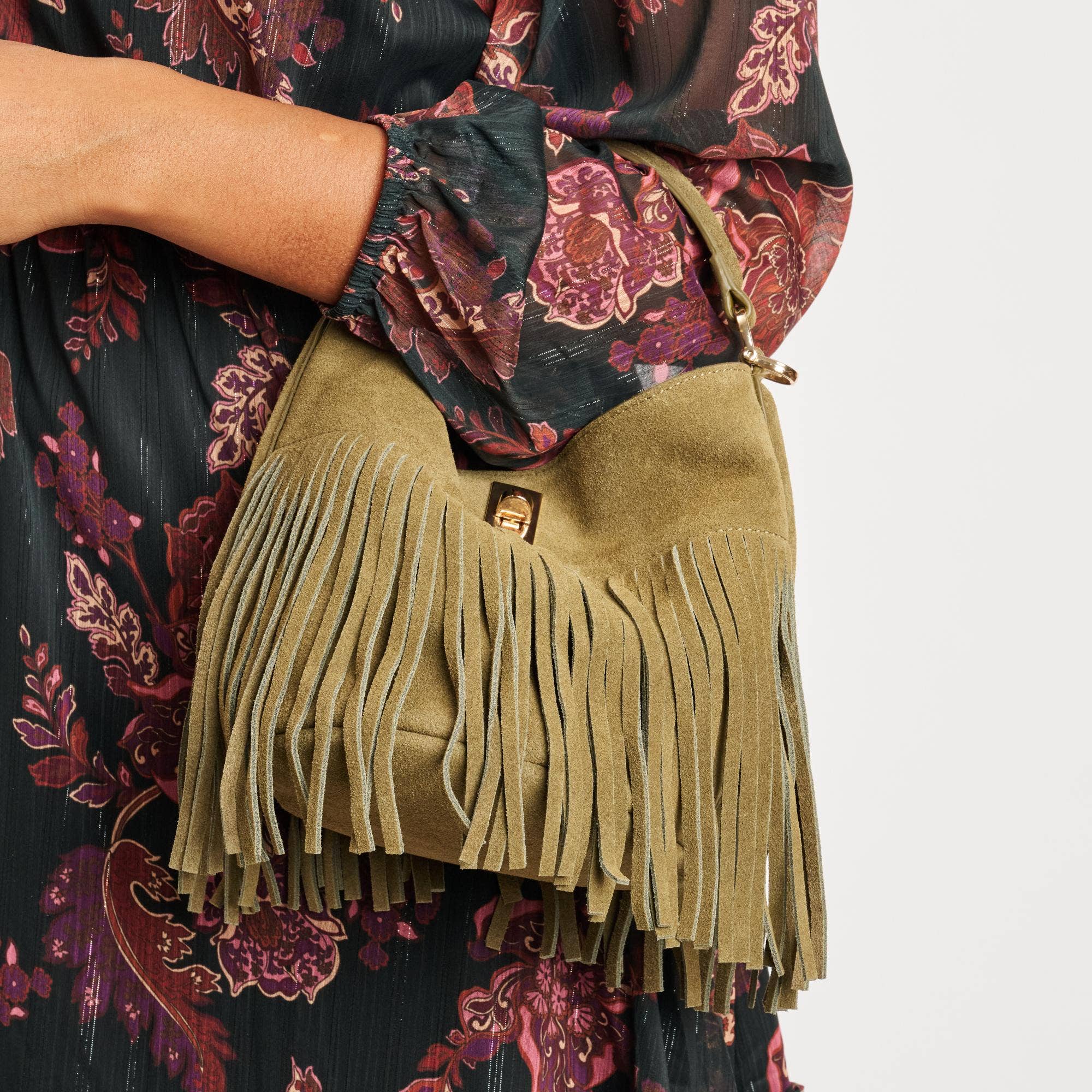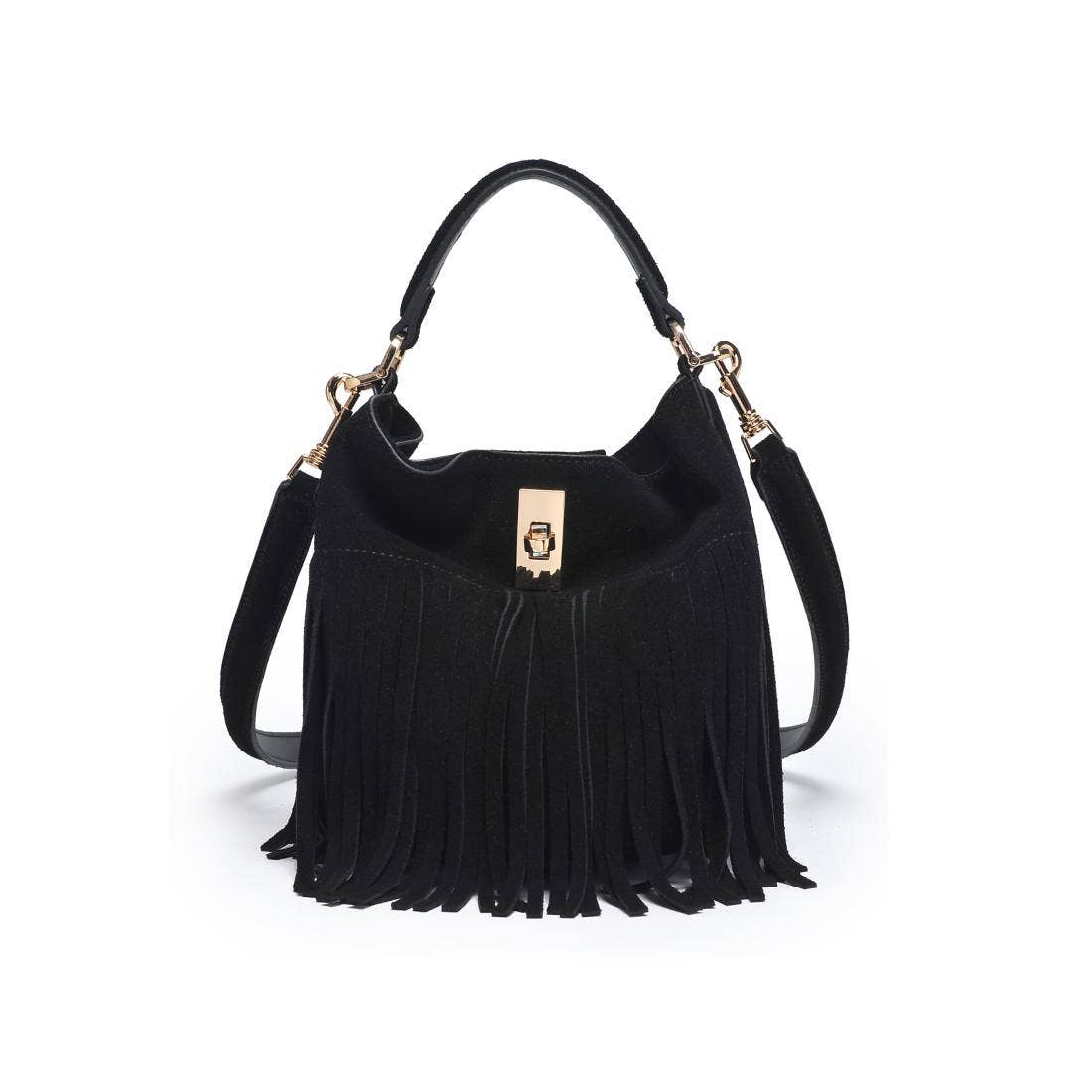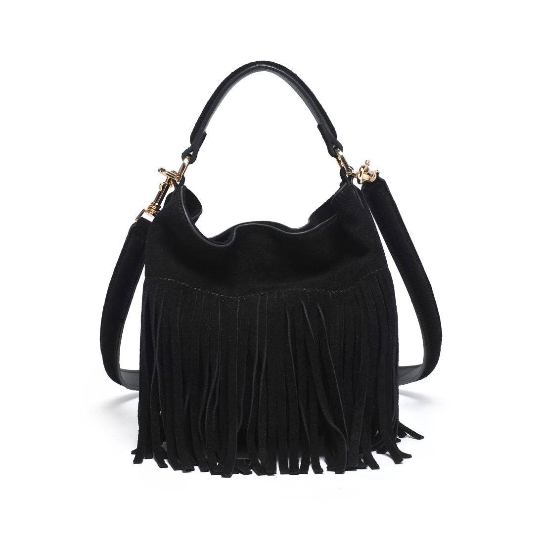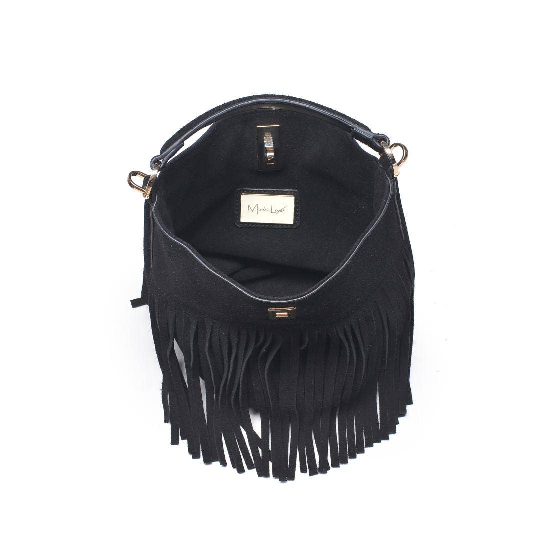 This chic bag features playful fringe detailing that adds a touch of movement, while the sleek silhouette ensures versatility for day-to-night wear.