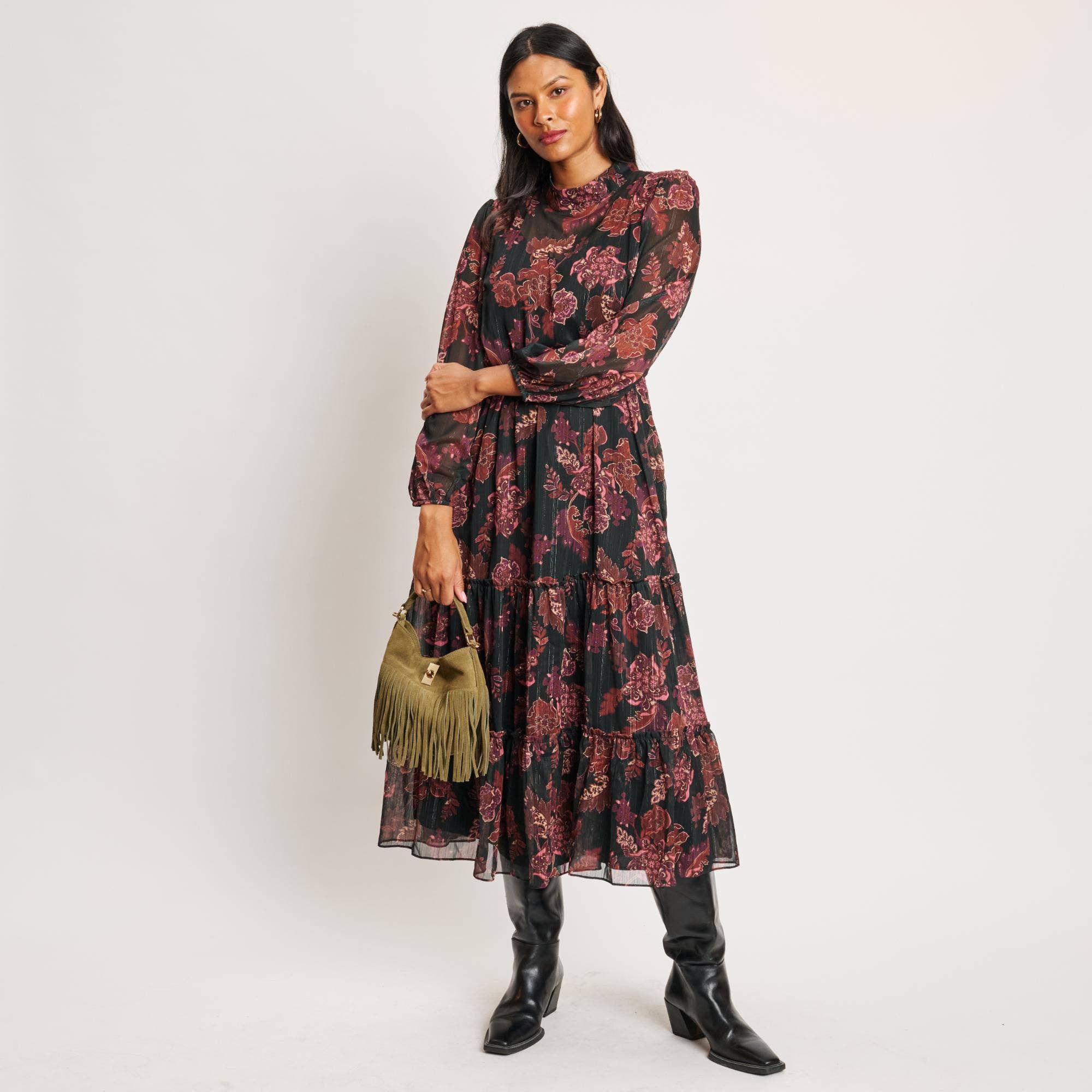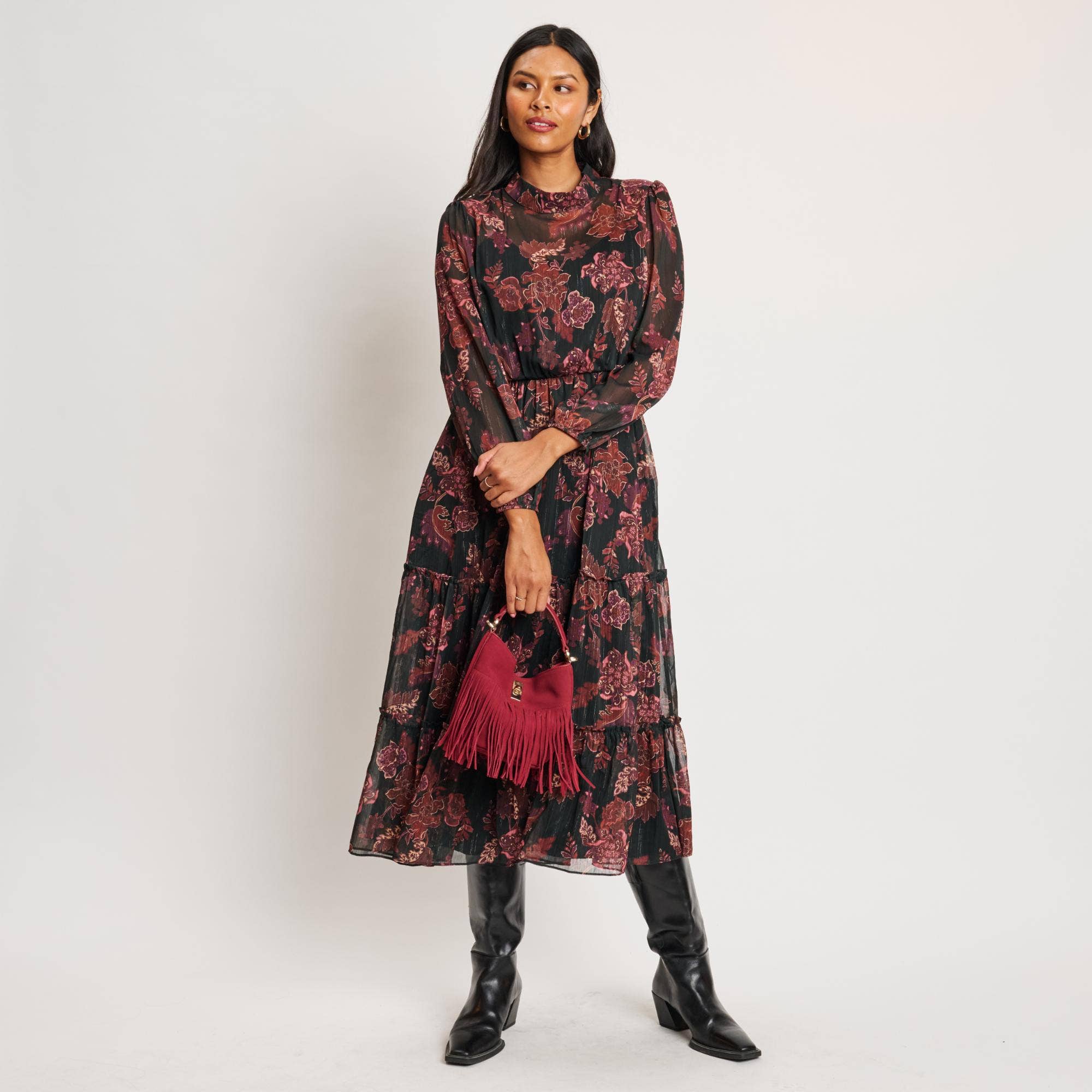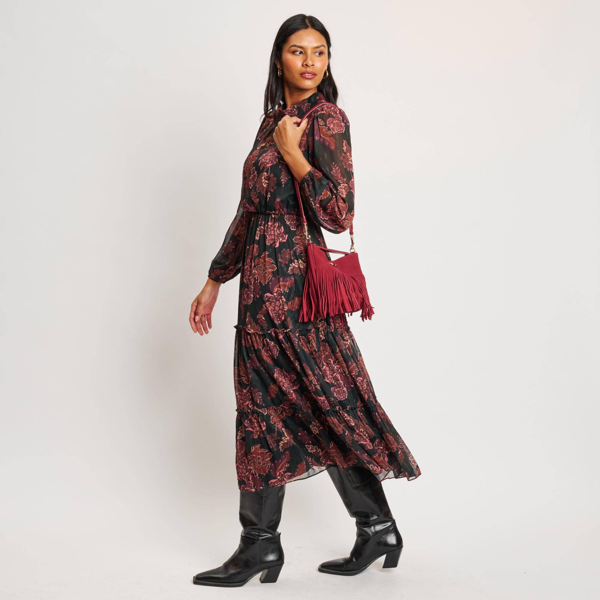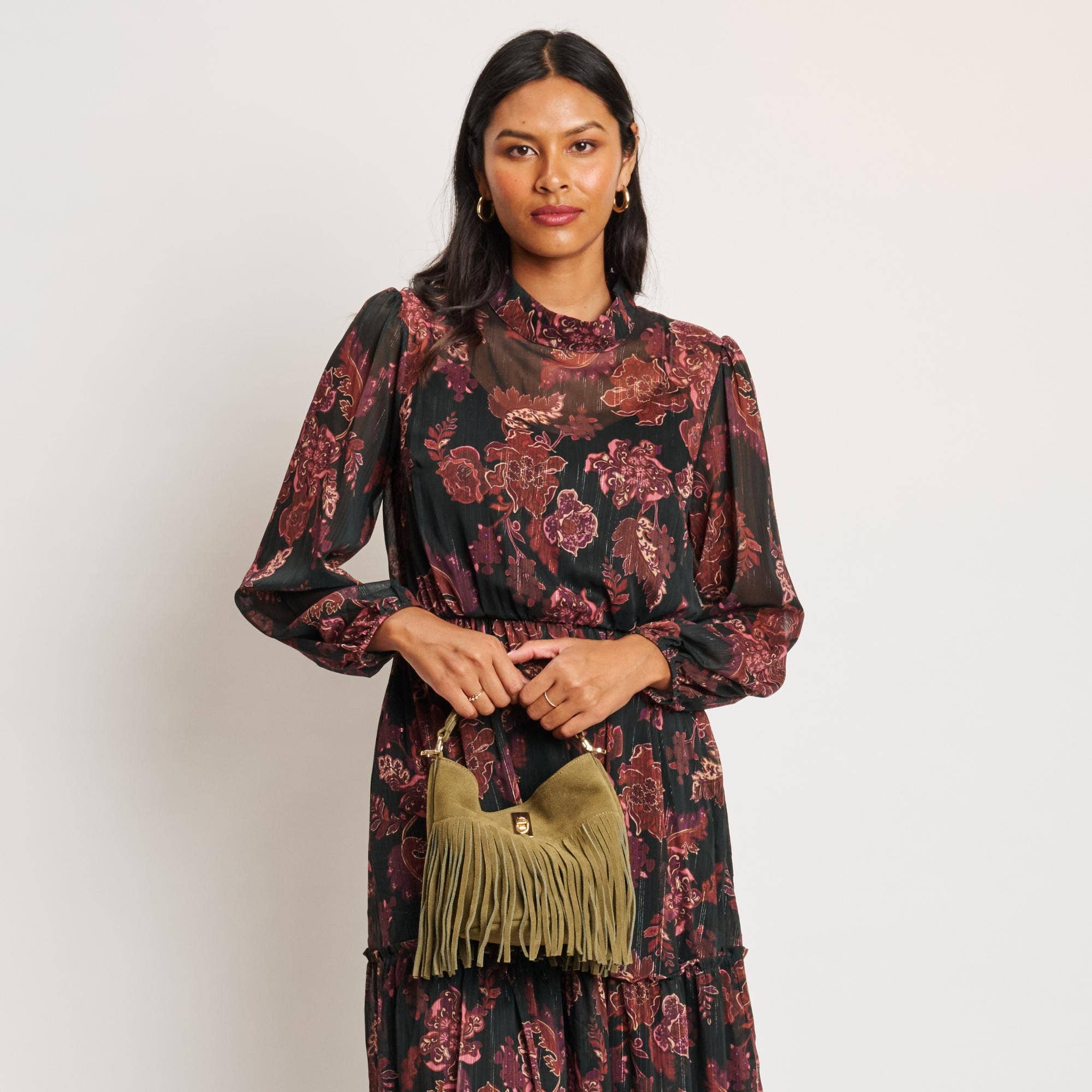 This chic bag features playful fringe detailing that adds a touch of movement, while the sleek silhouette ensures versatility for day-to-night wear.