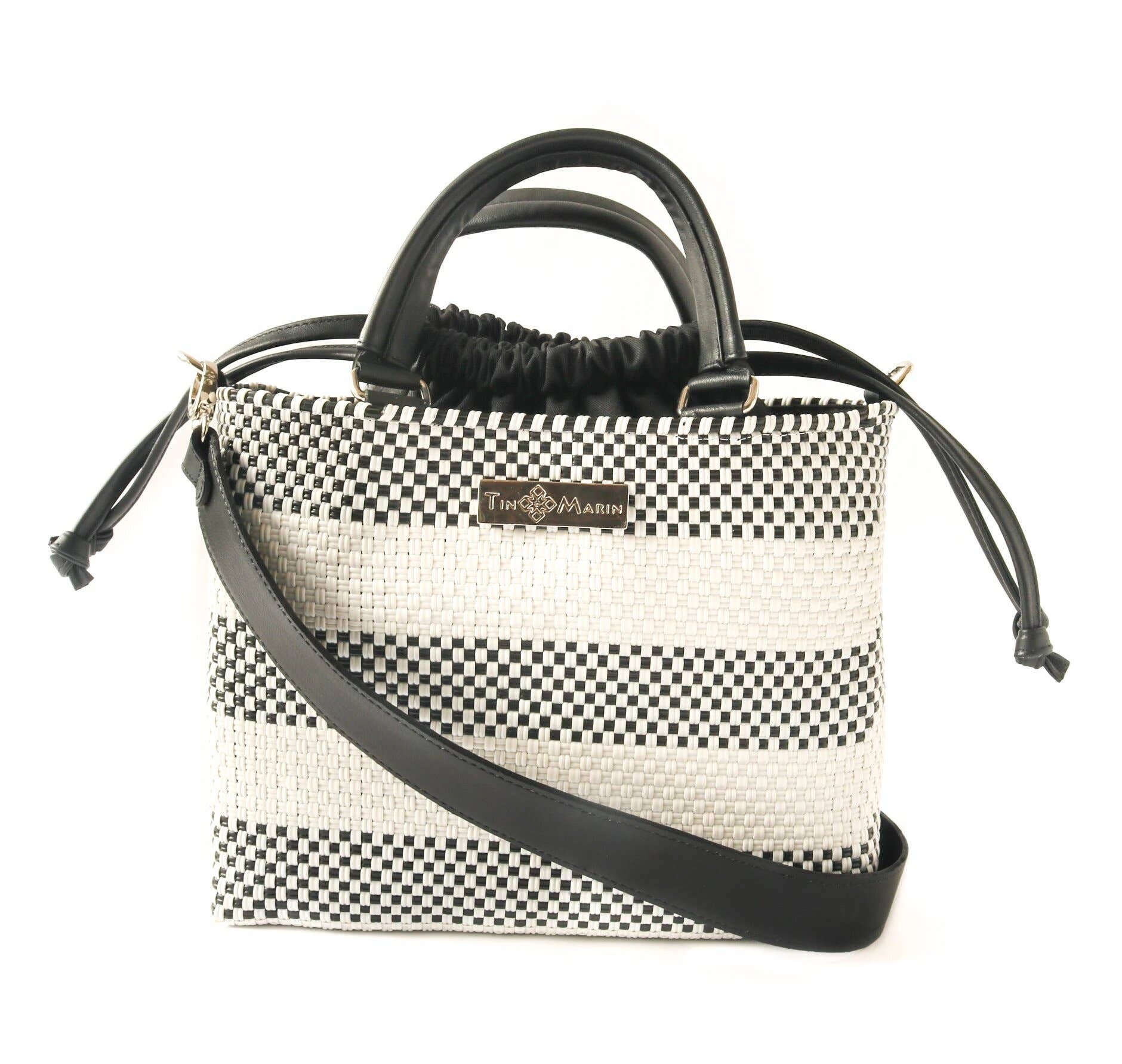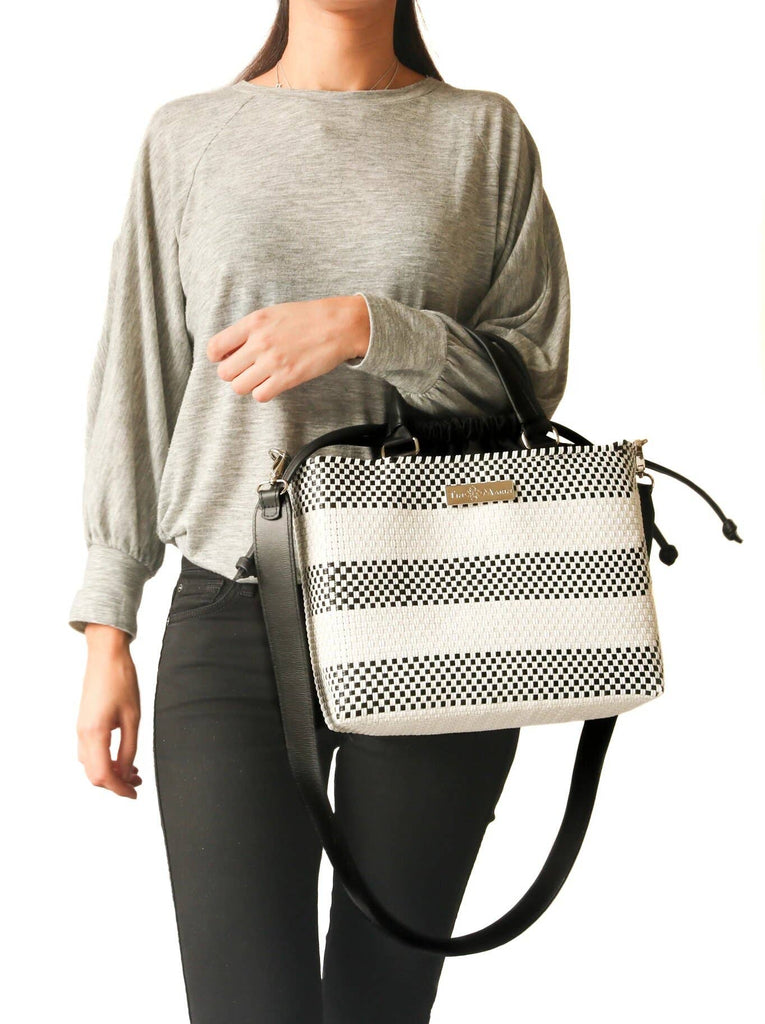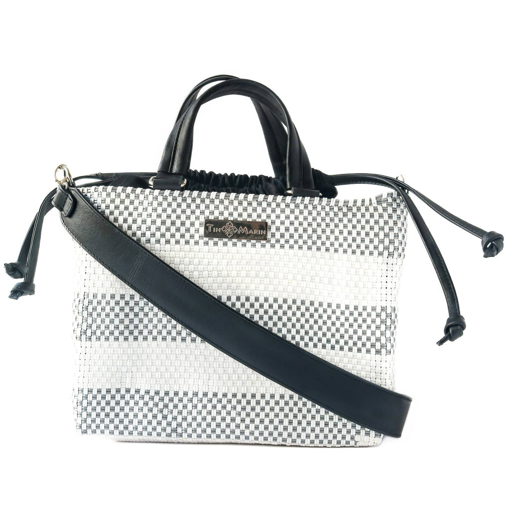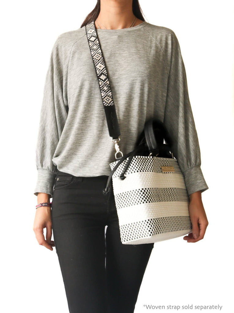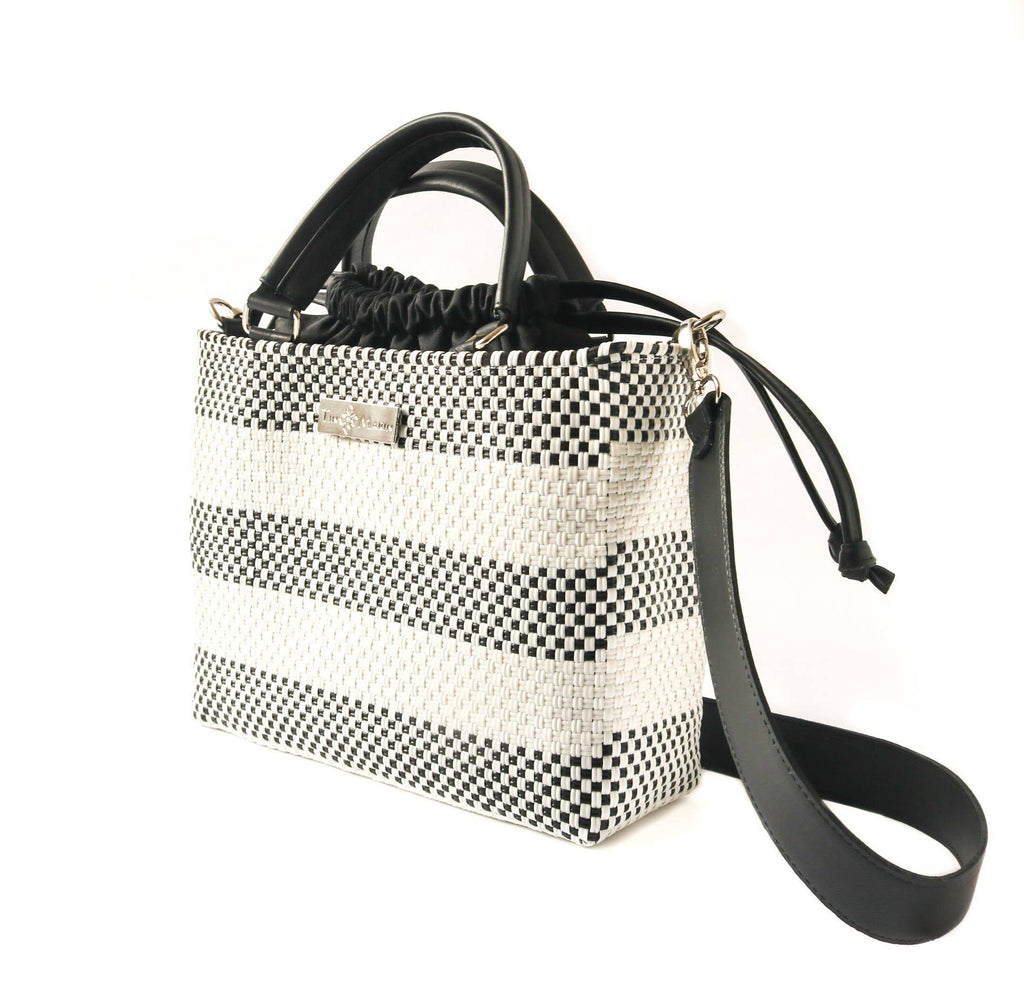 Lolo Medium Woven Plastic Crossbody Bag with Drawstring: Black & White