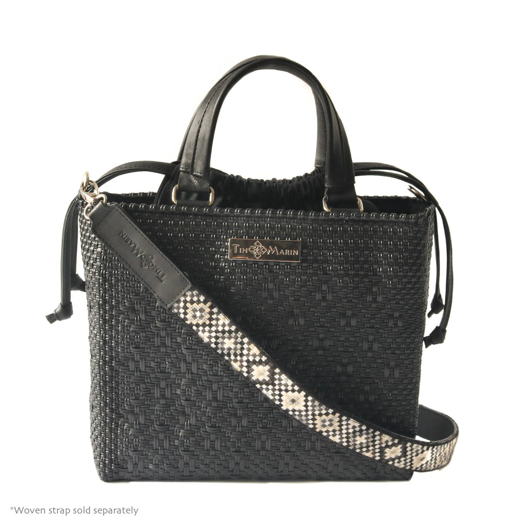 Lolo Medium Woven Plastic Crossbody Bag with Drawstring: Black & White