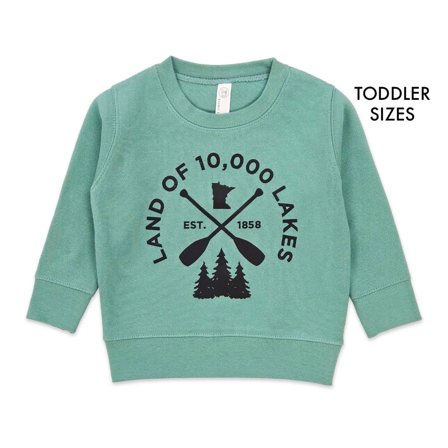 Toddler-sized crewneck sweatshirt in a dusty blue green. Features our Land of 10,000 Lakes design on the front in black. * 60/40 cotton/polyester * Coverstitched collar, shoulders, armholes, ribbed cuffs and waistband