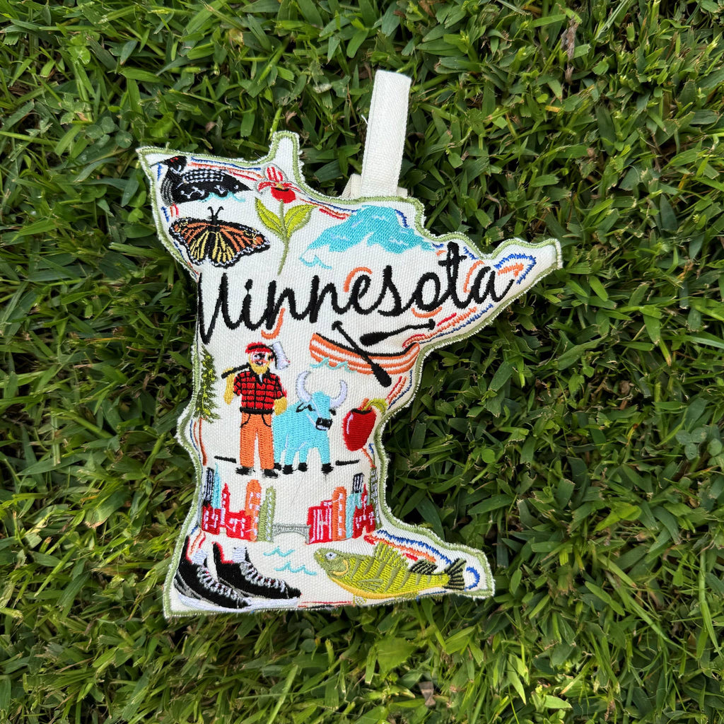 The Minnesota Wish You Were Here Dog Toy features colorful, embroidered icons and imagery of all things we love about Minnesota. Keep your pooch from developing a paunch with our Wish You Were Here Dog Toy. Shaped like the region they celebrate and styled like vintage postcards, these fun dog toys make great gifts! Size (inches): appox. 6.00 w x 2.00 d x 7.50 h Design Features: * Hand embroidered cotton canvas with details about each region * Cotton stuffing and squeaker make it fun for the dog * So cute you might want to use it as a small pillow * Use for throwing, holding, and playing Care: * Spot clean by hand * Line dry * Have fun!