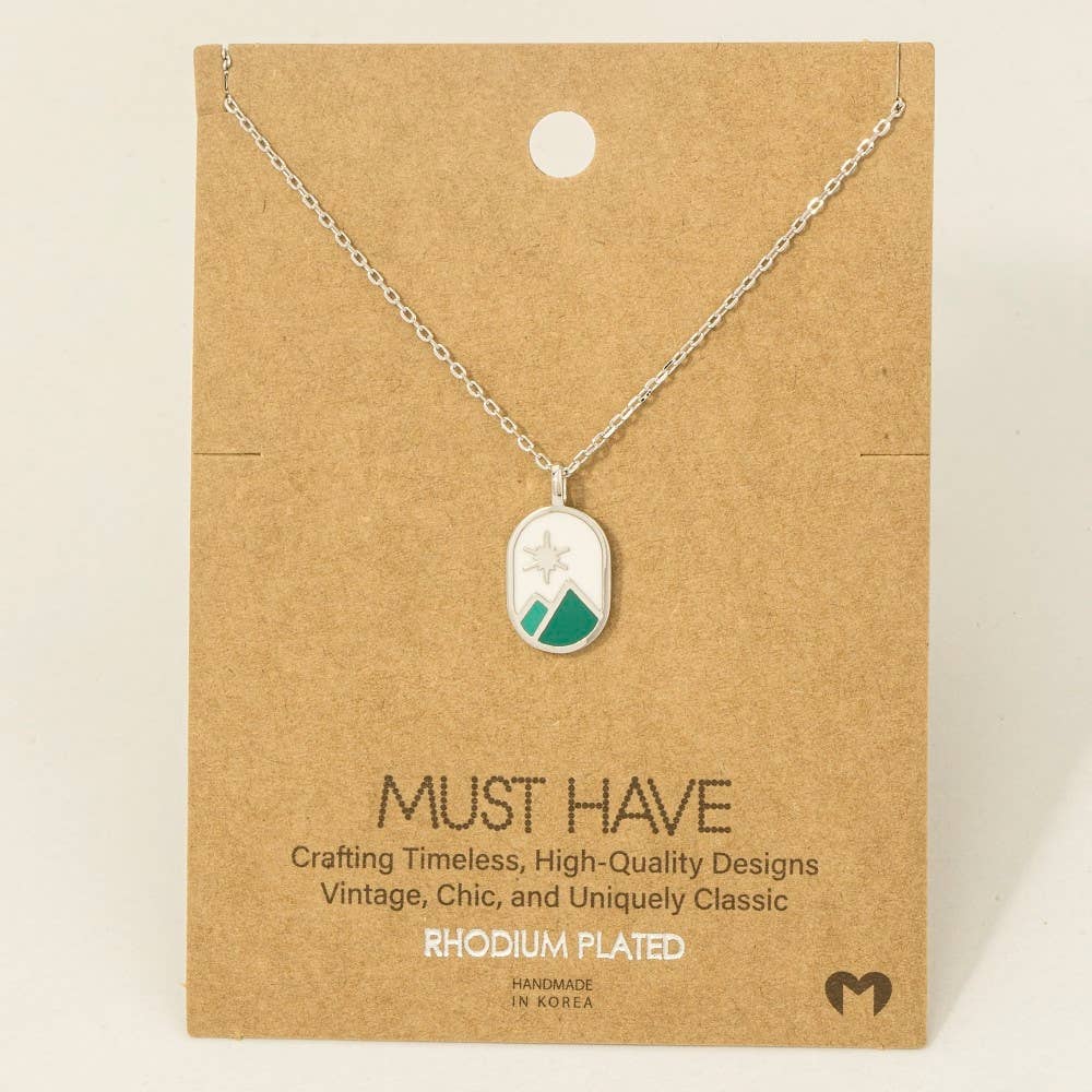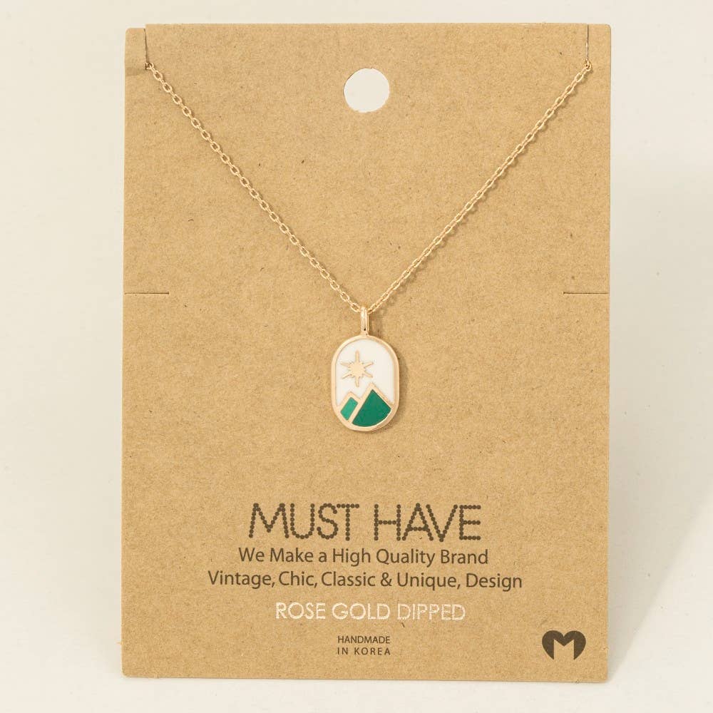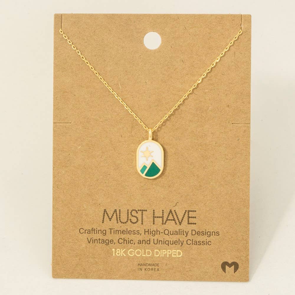 This trending necklace introduces a stunning gold dipped oval mountain range coin charm necklace style. Explore a blend of classic charm and contemporary flair.