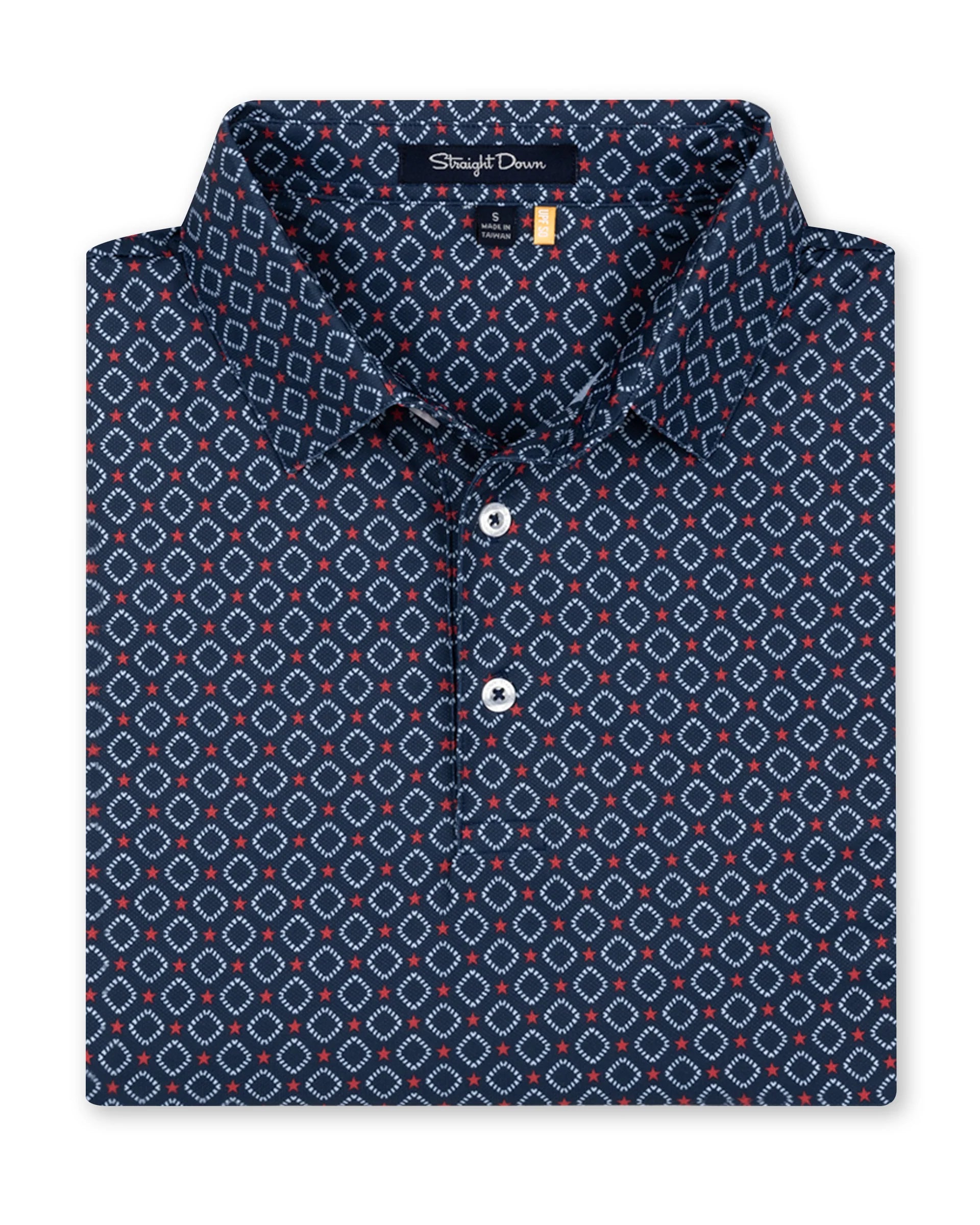 Clean, classic, and quietly patriotic. The All American Polo features a geometric print with subtle star motifs—offering a timeless nod to American pride without going over the top.