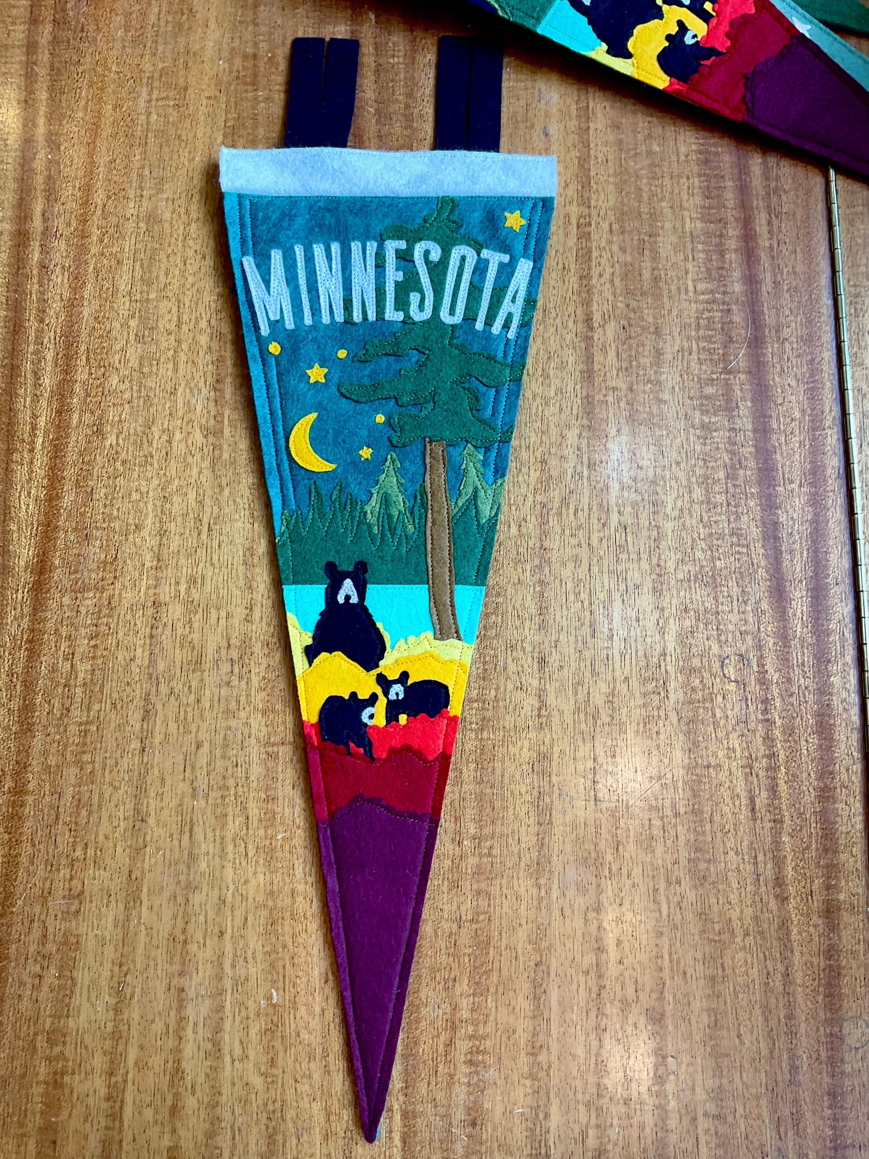 Each pennant measures approximately 19" wide x 7.5" high and is hand crafted fromĀ 100% sewn & stitched felt—built to last and made to display. Featuring bold designs that celebrate local landmarks and the great state of Minnesota, these are perfect for walls, shelves, dorms, and more!