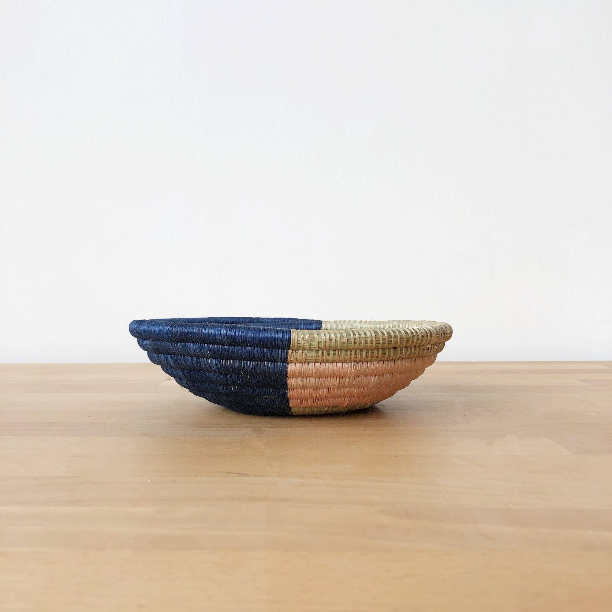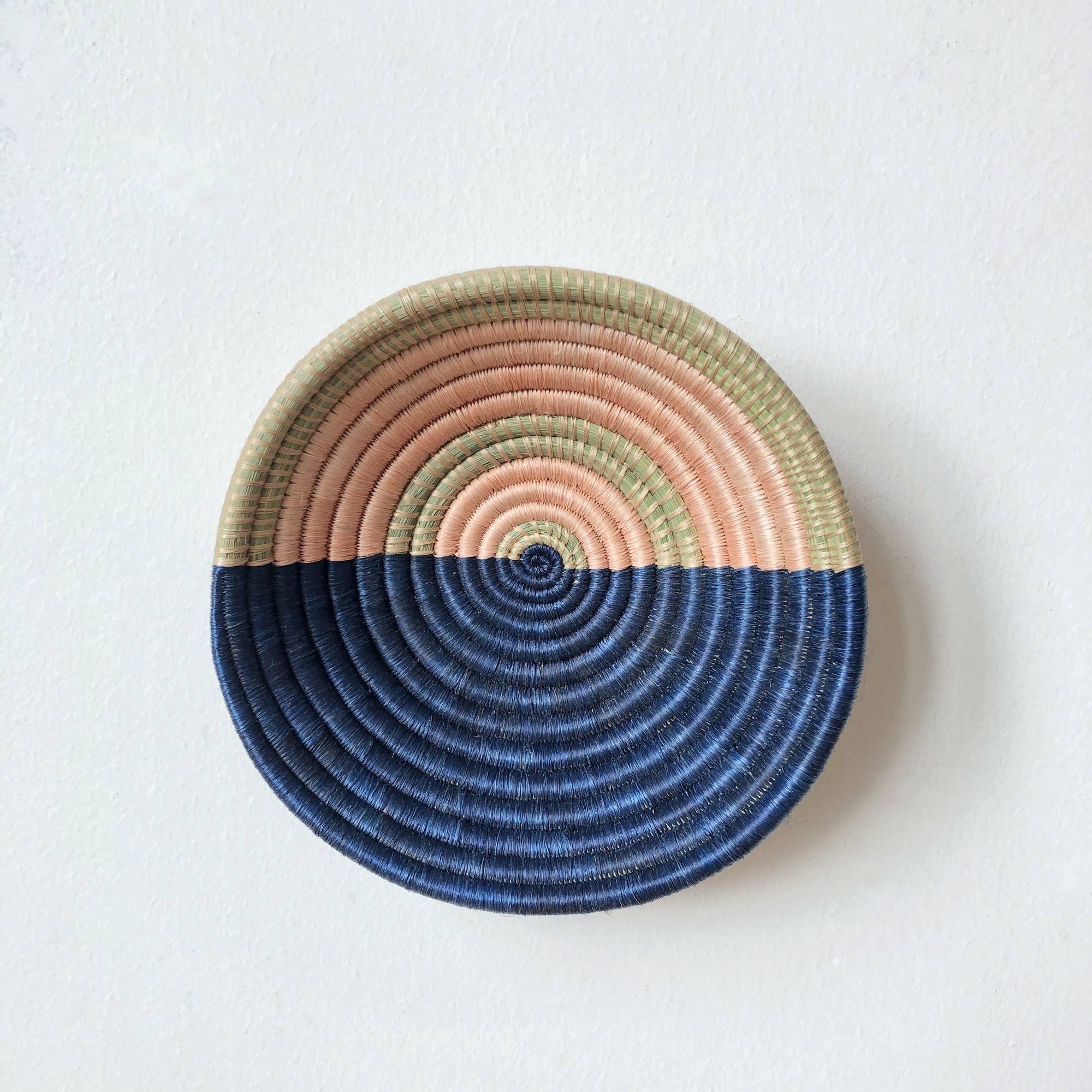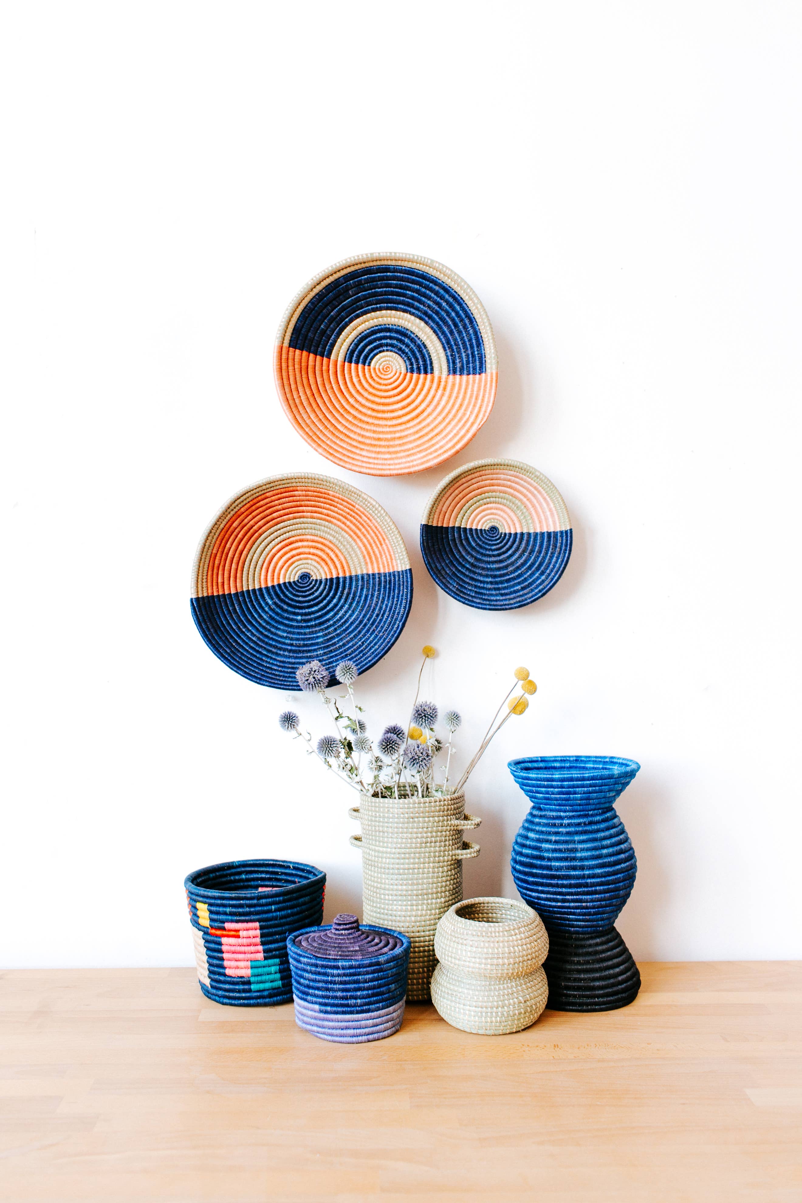 This sisal, woven basket is approximately 8" in diameter and woven by our artisans in Gitarama, Rwanda. The sisal is woven around sweetgrass, a fragrant grass with a subtle sweetness. In addition to making a beautiful table display, these baskets can also be hung as art. There is a loop on the back for hanging.