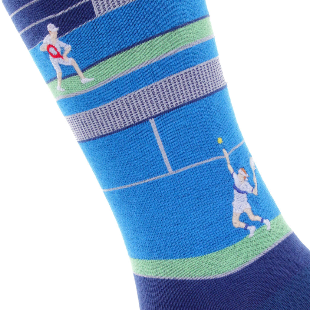 Crafted from our soft pima cotton-blend, these dark blue men's socks feature an intricate Tennis scene with embroidered players facing off against each other. Finished with wide ribbed cuffs and extra stretch for comfort! Truly gift-worthy, our socks stand out on display!